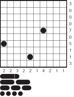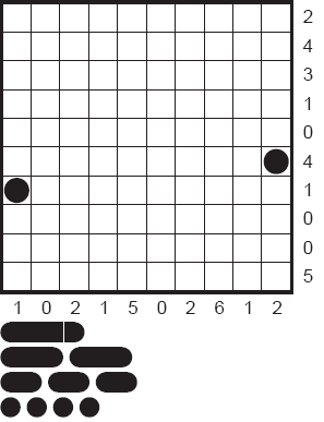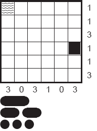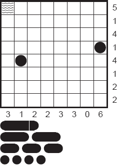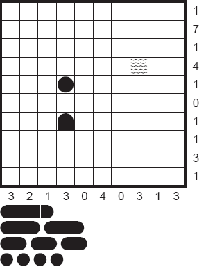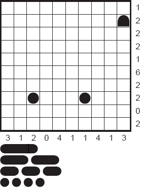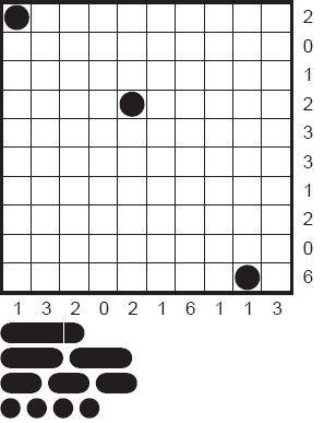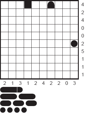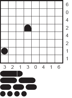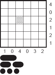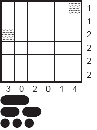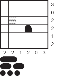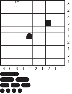 هذا النوع من الألغاز لا يمكننا اعتباره لغزا يابانيا وإنما أودرناها هنا لكونها شبيهة بالألغاز اليابانية . وكان هذا اللغز لعبة تلعب من قبل لاعبين ولم تأخذ شكل لغز يحل من قبل شخص واحد إلا في عام 1982 حيث نشرت لأول مرة في مجلة ( Humor and Juegos ) الأرجنتينية وباللغة الاسبانية وفي عددها الصادر في شهر تشرين الثاني من ذلك العام . وشكلها التقليدي عبارة عن شبكة بأبعاد ( 10×10 ) وقد أخفيت فيها عشرة سفن وهي ( سفينة حربية واحدة بطول أربعة مربعات, وطرادان -سفينة المطاردة- بطول ثلاثة مربعات , و ثلاثة مدمرات بطول مربعين , وأربعة غواصات بطول مربع واحد ) . أما المعطيات فهي عدد قطع السفينة في كل صف وعمود مع بعض قطع السفينة داخل الشبكة . لاحظ الشكلين أدناه الذي يمثل اللغز على اليمين والحل على اليسار: |