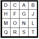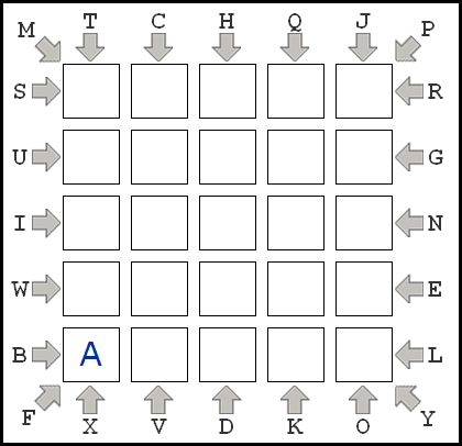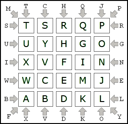من الألغاز الحديثة العهد لغز المسار الأبجدي. في هذا النوع من الألغاز عليك إيجاد جميع الأحرف الأبجدية المخفية الـ (25) بدأ من الحرف (A) وانتهاء بالحرف (Y) حيث يجب أن يتصل كل حرف بالحرف الذي يليه أفقيا أو عموديا أو قطريا ,كما يجب أن يقع كل الحرف ضمن الصف أو العمود أو القطر المشار اليه .لاحظ المثال أدناه الذي يمثل اللغز على اليمين والحل على اليسار. |
