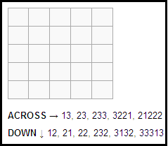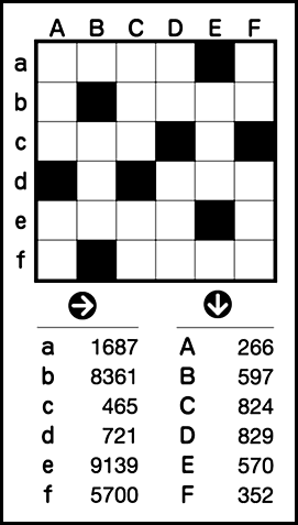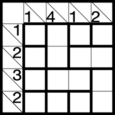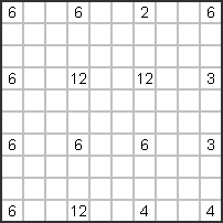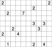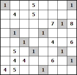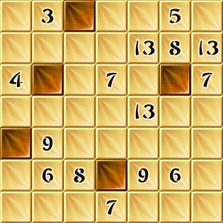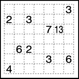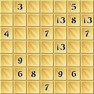 المطلوب ملئ الشبكة بالأرقام المعطاة أفقيا وعموديا وقد يتم تحديد الفواصل (المربعات السوداء) أو لا يتم ذلك لزيادة صعوبة اللغز كما هو الحال في المثال أدناه: |