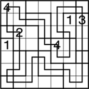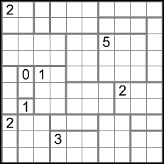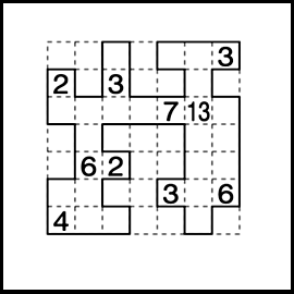 المطلوب في هذا النوع من الألغاز تقسيم الشبكة إلى مناطق مستطيلة أو مربعة بعدد من المربعات مساوية لكل رقم .لاحظ الشكلين أدناه الذي يمثل اللغز على اليمين والحل على اليسار: | ||