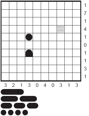 هذا النوع من الألغاز لا يمكننا اعتباره لغزا يابانيا وإنما أودرناها هنا لكونها شبيهة بالألغاز اليابانية . وكان هذا اللغز لعبة تلعب من قبل لاعبين ولم تأخذ شكل لغز يحل من قبل شخص واحد الا في عام 1982 حيث نشرت لأول مرة في مجلة ( Humor and Juegos ) الأرجنتينية وباللغة الاسبانية وفي عددها الصادر في شهر تشرين الثاني من ذلك العام . وشكلها التقليدي عبارة عن شبكة بأبعاد ( 10×10 ) وقد أخفيت فيها عشرة سفن وهي ( سفينة حربية واحدة بطول أربعة مربعات, وطرادان -سفينة المطاردة- بطول ثلاثة مربعات , و ثلاثة مدمرات بطول مربعين , وأربعة غواصات بطول مربع واحد ) . أما المعطيات فهي عدد قطع السفينة في كل صف وعمود مع بعض قطع السفينة داخل الشبكة . لاحظ الشكلين أدناه الذي يمثل اللغز على اليمين والحل على اليسار: |
