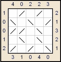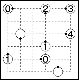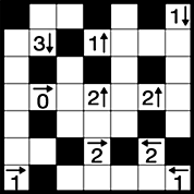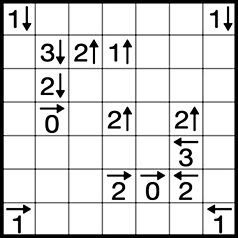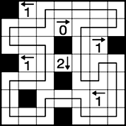 شبيه للحواجز. المطلوب رسم خط متصل يشكل منحني مغلق . كما هي الحال في الحواجز لا يجوز أي يتقاطع أي خط ولا يجوز أن يشكل منحنيان منفصلان ويكون الانتقال أفقيا وعموديا فقط يتم وضع حواجز (تلوين المربعات باللون الأسود) في حالة عدم المرور بها . تشير الأرقام إلى عدد الحواجز (المربعات السوداء) في اتجاه كل سهم. لا يجوز تجاور أي مربعين كما لا يجوز المرور او وضع الحواجز على المربعات التي تحمل أرقاما. لاحظ المثال أدناه: |
