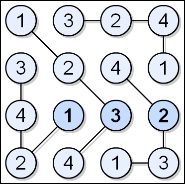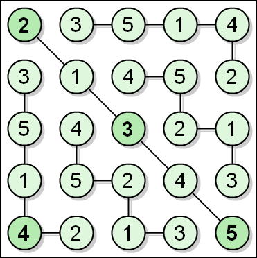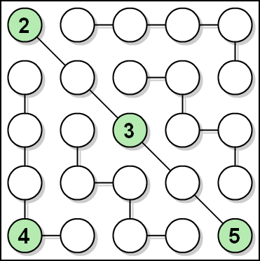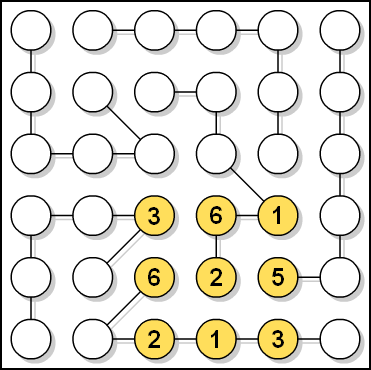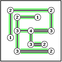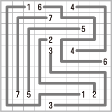هذا النوع من الألغاز ذات قواعد بسيطة والمطلوب ربط أزواج الارقام بخطوط (أفقيا وعموديا فقط) دون تقاطع الخطوط ودون المرور من مربع فيه رقم آخر. لاحظ المثال أدناه: | ||