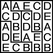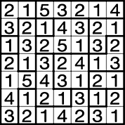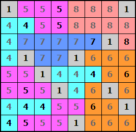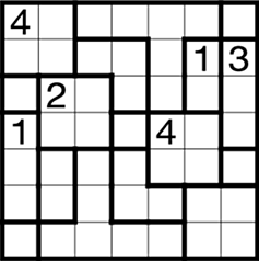 شبيه بالسودوكو الغير منتظم مع بعض الاختلافات البسيطة. المطلوب ملئ الغرف بالأرقام (حسب عدد المربعات في كل غرفة) بدون تكرار في الغرفة الواحدة وإذا صادف تواجد رقمين في نفس الصف أو العمود فيجب أي يكون بينها وبين الرقم الآخر مسافة مساوية أو أكثر منه (من الرقم). لاحظ المثال أدناه: |