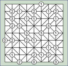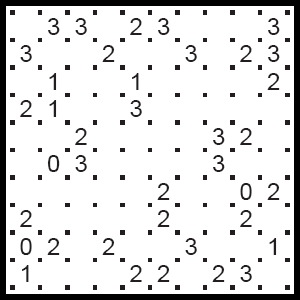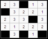 3) كاسح الألغام : هذا النوع يشبه إلى حد كبير لعبة كاسح الألغام المتوفرة على برامج الويندوز , في هذا اللغز يكون الأرقام داخل الشبكة ويشير كل عدد إلى عدد النقاط الموجودة في المربع مع المربعات المحيطة الثمانية المحيطة بها . وينتج بعد حلة الصورة المطلوبة. | ||