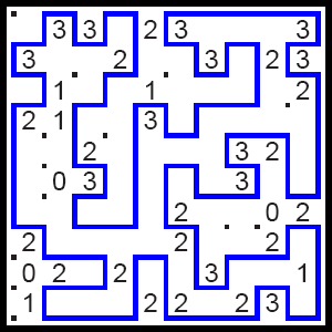 هذا النوع من الألغاز يجمع بين ألغاز الحواجز وألغاز الكوروماسو . المطلوب رسم منحني مغلق ويشير الأرقام إلى عدد المربعات التي الأفقية والعمودية داخل الحقيبة ,لاحظ المثال ادناه: |