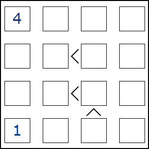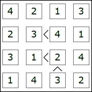 المطلوب ملىء المربعات الفارغة بالأرقام على أن لا يتكرر نفس الرقم في نفس الصف أو العمود (يجوز تكرار الرقم قطريا) ,كما يجب مراعاة أن الرقم باتجاه علامة الأكبر (>) أكبر من الرقم الذي يجاوره. لاحظ المثال والحل: | ||