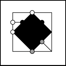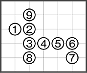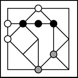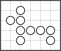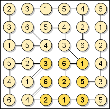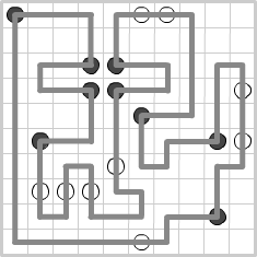 شبيه للحواجز. المطلوب رسم خط متصل يشكل منحني مغلق . كما هي الحال في الحواجز لا يجوز أي يتقاطع أي خط ولا يجوز أن يشكل منحنيان منفصلان ويكون الانتقال أفقيا وعموديا فقط. ويخضع هذا النوع من الألغاز لبعض القواعد وهي أن يكون الخط المار من الدوائر البيضاء مستقيما ويجب أن ينحني الخط المار من الدائرة البيضاء من طرف واحد على الأقل . بينما يكون الخط المار من الدائرة السوداء مائلا (غير مستقيم) ويجب أن يمتد لمربعين على الأقل. كما يجب المرور من جميع الدوائر بدون استثناء. لاحظ المثال المحلول أدناه: |