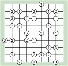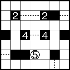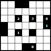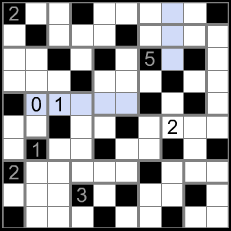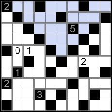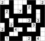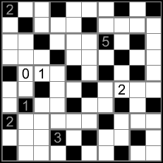 المطلوب في هذا اللغز وضع حواجز (مربعات سوداء) بحيث يكون عدد المربعات المحيطة بالمربعات التي تحمل الأرقام (أفقيا وعموديا) مساويا للرقم الذي يحمله .وتعتبر المربعات التي تحمل الأرقام مربعا فارغا ولا يجوز وضع الحواجز على مربع يحمل رقما ولا يجوز أن تتجاور حاجزان أفقيا وعموديا ويجب أن يكون بقية المربعات الفارغة (البيضاء) متصلة فيما بينها. لاحظ المثال أدناه: |