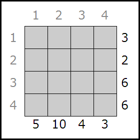 ا المطلوب التأشير على المربعات الفارغة (اختيار المربعات الفارغة) بحيث يكون الناتج مساويا للمجموع المعطى (يمين وأسفل) حيث أن قيمة مربعات الصف الأول هي واحد والصف الثاني اثنان والثالث ثلاثة والرابع أربعة ,في حالة الجمع العمودي. أما في حالة الجمع الأفقي فإن قيمة مربعة العمود الأول تساوي واحد والثاني اثنان والثالث ثلاثة والرابع أربعة . لاحظ المثال المحلول ادناه: |
