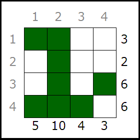 1) التقليدي : وهو النوع التقليدي للغز حيث يعطي عدد المربعات المتصلة ببعضها في كل صف وعامود والمطلوب ايجاد الصورة. | ||