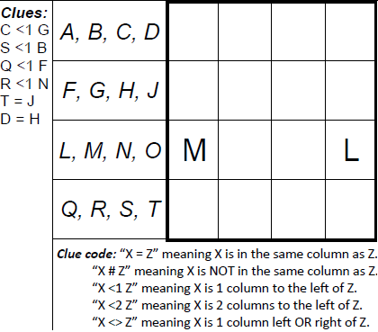 من الألغاز التي يعود إلى اليابانيين الفضل في ابتكارها ألغاز (كاروجي) . يتكون هذا النوع من الألغاز من شبكة فارغة من المربعات بأبعاد (3×3) و (4×4) و (5×5) ومجموعة من التعليمات على يسار الشبكة . المطلوب وضع الأحرف على الشبكة ضمن القواعد الخاصة على يسار الشبكة. تتضمن القواعد : الأحرف في كل سطر وكلها معطى. والمجموعة الثانية هي التي تدل على مواقع الأحرف في الأعمدة (مثلا X=G تعني بأن X في نفس عمود G ) وغيرها كما هو موضح في المثال أدناه: |