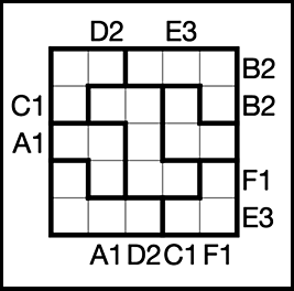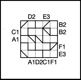 الأصح تسمية هذا النوع من الألغاز بـ (المرايا العاكسة) يتألف هذا النوع من عدة غرف والمطلوب وضع مرآة عاكسة واحدة فقط في كل غرفة بوضع مائل يسمح بعكس الشعاع المنبعث من حرف إلى نفس الحرف المقابل (جميع المرايا عاكسة في الوجهين) .يشير الرقم المجاور للحرف إلى عدد مرات الانعكاس ليصل إلى الحرف المناظر له. لا يجوز مطلقا انطلاق الشعاع إلى حرف آخر. لاحظ المثال أدناه: |