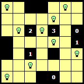 المطلوب إضاءة جميع مربعات الشبكة حيث يضيء كل مصباح جميع المربعات حوله (أفقيا وعموديا) وليس قطريا . تشير الأرقام إلى عدد المصابيح حول المربع (أفقيا وعموديا فقط) ولا يجوز أن يضيء أي مصباح مصباحا آخر. لاحظ المثال أدناه: | ||