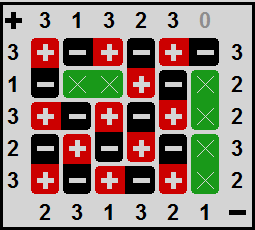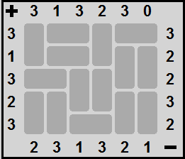 تتألف ألغاز المغناطيس من شبكة مختلفة الأحجام والمطلوب إيجاد عدد ووضعية المغانط وفق المعطيات حيث يدل كل عدد اعلى ويسار اللغز على عدد الأقطاب الموجبة بينما يدل الأعداد يمين وأسفل الشبكة على عدد الشحنات السالبة. طبعا لا يجوز وضع أقطاب متشابه متجاورة حيث أنها ستتنافر. لاحظ اللغز وحله على اليسار. ولمزيد من الاطلاع اضغط هنا. | ||