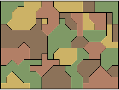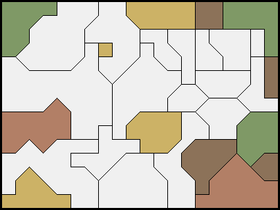 ألغاز الخرائط تستند إلى نظرية رياضية تقول (بالإمكان صبغ أية خريطة بأربعة ألوان دون أن يتجاور أية منطقتان -دولتان مثلا- بنفس اللون). المطلوب صبغ جميع مناطق الخريطة بأربعة ألوان دون أن يشترك أية منطقتين بنفس اللون. الصعوبة هي في أن بعض المناطق مصبوغة مسبقا. لاحظ اللغز حله على اليسار. | ||