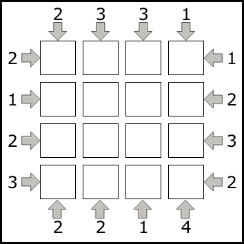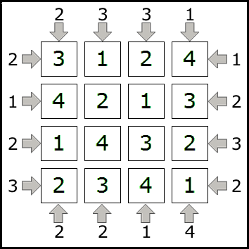 في هذا اللغز المطلوب ملئ المربعات الفارغة بالأرقام ,حيث يشير كل رقم إلى عدد طوابق العمارة أو ناطحة السحاب. ويشير الأرقام حوله إلى عدد العمارات الممكن رؤيتها فإذا كانت العمارة ذات الطوابق الأربعة في المقدمة فسيحجب عنا روية بقية العمارات والعكس صحيح فإذا كانت العمارة الأصغر ذات الطابق الواحد قي المقدمة ويليه الثاني ثم الثالث ثم الرابع فسيكون من الممكن رؤية العمارات الأربعة جميعا .يجب مراعاة عدم تكرار نفس الرقم أفقيا وعموديا. لاحظ المثال أدناه: |