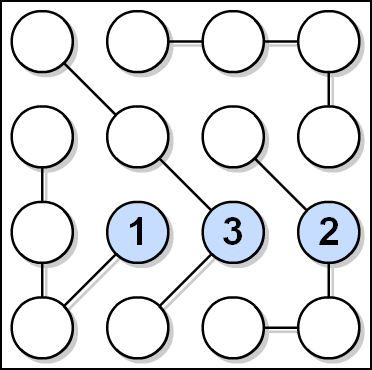 هذا النوع من الألغاز عبارة عن رفع القطع بطريقة معينة. المطلوب البدء من قطعة معينة ثم الانتقال أفقيا وعموديا (لا يجوز الرجوع) ولا يجوز الانتقال إلى مربع فارغ لحين رفع جميع القطع . لاحظ المثال أدناه الذي يمثل اللغز على اليمين والحل (الأرقام تشير إلى تسلسل رفع القطع): |