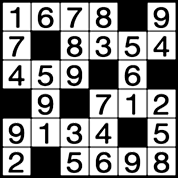 6) السودوكو الفردي أو المتطابق : في هذا النوع يحدد عدد من المربعات بلون داكن ( رمادي عادة) والمطلوب أن يكون الأرقام في هذه المربعات فردية أو متطابقة حسب ما يطلبه اللغز. | ||
