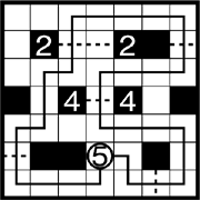 شبيه للحواجز. المطلوب رسم خط متصل يشكل منحني مغلق . كما هي الحال في الحواجز لا يجوز أي يتقاطع أي خط ولا يجوز أن يشكل منحنيان منفصلان ويكون الانتقال أفقيا وعموديا فقط الخطوط المتقطعة تشير إلى البوابات ويجب المرور من جميع البوابات. يتم البدء من المربع المفتوح (الرقم خمسة في هذا المثال) ويشير الرقم داخله إلى عدد البوابات التي سيمر بها خلال مساره بينما تشير الارقام (داخل المربعات السوداء إلى تسلسل مرور الخط المنحني ( اذا افترضنا بأننا بدأنا بالرقم خمسة نزولا ثم انتقلنا باتجاه عقارب الساعة فسنمر من البوابة الأولى أسفل اليمين ثم المجاور للرقم 2 ثم أعلى اليمين ثم المجاور للرقم 4 وهكذا) . لاحظ المثال أدناه: |