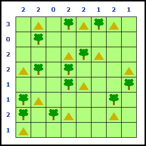 المطلوب كشف أماكن المخيمات حيث يرتبط كل خيمة بشجرة واحدة فقط وتشير الأرقام أعلى ويسار اللغز إلى عدد المخيمات .لا يرتبط أي خيمة بشكل قطري بأية شجرة (تقع أفقيا وعموديا مباشرة وبدون فاصل) ولا يتجاور أية خيمة مع أية خيمة أخرى (أفقيا وعموديا وقطريا) . لاحظ المثال أدناه: |