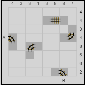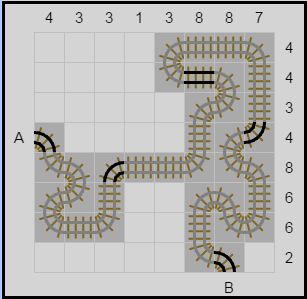 اصطلحنا كلمة (سكة الحديد) بدل من الكلمة الأصلية (طريق) على هذا النوع من الألغاز وذلك لتجنب الالتباس مع الغاز أخرى تحمل أسماء مرادفة. المطلوب في هذا النوع من الألغاز إيجاد طريق سكة الحديد وفقا للمعطيات حيث يدل كل رقم على عدد قطع السكة افقيا وعموديا. للاحظ اللغز وحله على اليسار. هذا النوع من الألغاز تجده في الموقع إضغط هنا. | ||