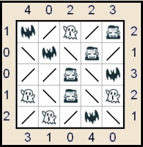 يتكون هذا النوع من الألغاز من شبكة مختلفة الأبعاد بعضها فارغة وبعضها ذات مرايا (بوجهين عاكسين) المطلوب وضع ثلاثة أنواع من الكائنات في المربعات الفارغة بحيث يحقق العدد المرئي المطلوب. الأشباح لا ترى مباشرة لكنها ترى بالمرآة العاكسة والخفاش على العكس ترى مباشرة لكنها لا ترى بالمرآة العاكسة وزومبي (الأحياء الأموات أو المومياء) يرى مباشرة وبالمرآة العاكسة ايضا. ويعطى عدد كل كائن مسبقا في بعض الألغاز. الشكل ادناه يمثل اللغز وحله على اليسار. | ||