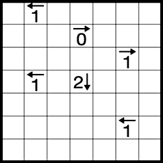 المطلوب كشف أماكن ويشير الحواجز (المربعات السوداء) حيث يشير الأسهم والأرقام إلى عدد الحواجز (المربعات السوداء) في اتجاه كل سهم. لاحظ المثال أدناه: |
