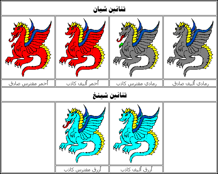 10)ظهر تنينان أمام فارس سألهما عن نوعهما ولونهما فأجاب الأول:(أنا من شينغ - أنا والتنين الثاني مفترسان) وأجاب الثاني:( التنين الأول ليس من شينغ أنا فقط منها - وأنا أليف) فما نوع ولون كل تنين؟ | ||||||||||||||||||||||||||||||||||||||