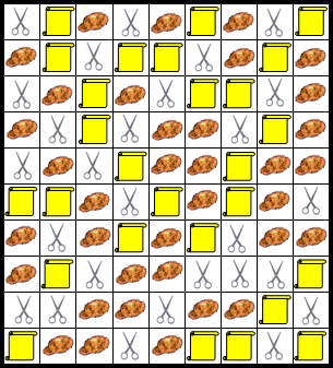 1) انتقل من المربع أعلى اليسار ( المقص ) و انتقل أفقيا وعموديا و قطريا لتصل إلى أسفل اليمين ( الورقة) مراعيا القاعدة ( مقص - ورقة - حجر ). اختر أقصر طريق.