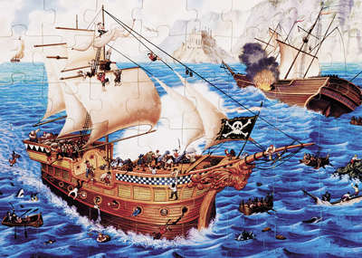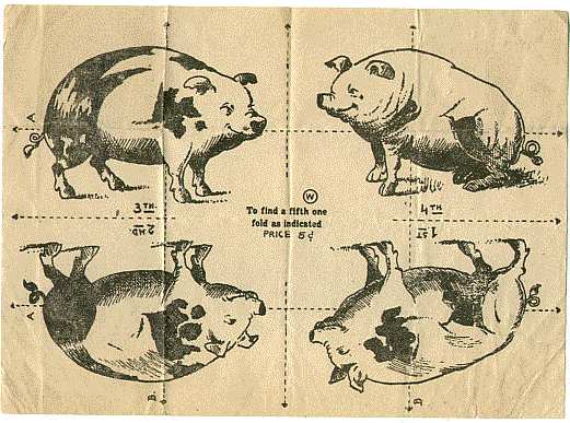 المطلوب في هذا النوع من الألغاز طي ورقة أو عدة أوراق بطريقة معينة للحصول على شكل معين مثل لغز الخنازير الخمسة.قبل الطي - الصورة اليمنى وبعد الطي - الصورة اليسرى. | ||||||
