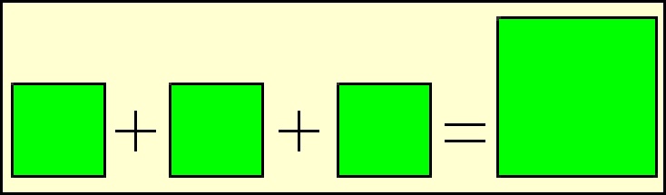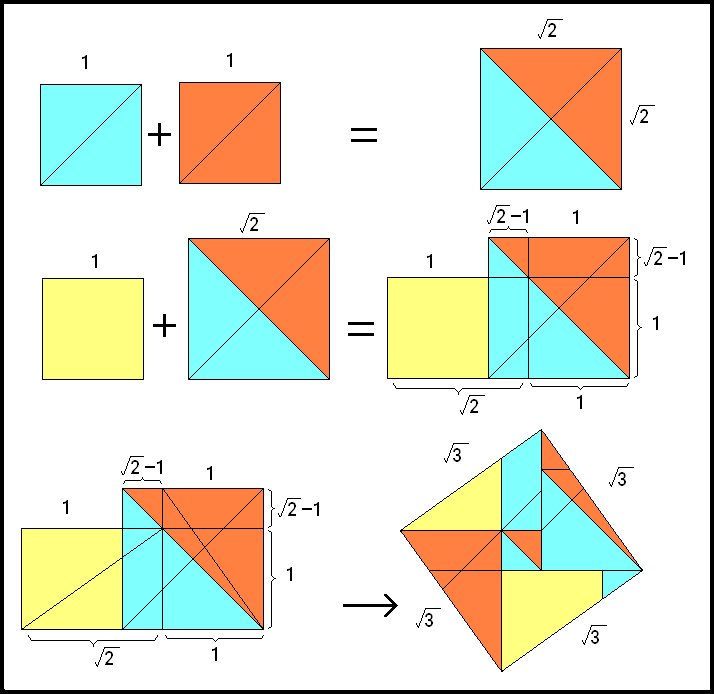 الآن قم بتقطيع ثلاث مربعات متطابقة كيفما شئت ثم اعد ترتيبها ليصبح لديك مربع كبير بطول ضلع هو جذر 3. | ||