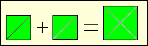 في هذا الشكل قمنا بتقطيع مربعين متطابقين إلى 4 أجزاء ثم قمنا بإعادة ترتيبها ليصبح لدينا مربع كبير بطول ضلع هو جذر 2 . | ||