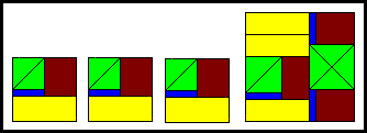 الشكل أدناه محاولة ذكية جدا لحل اللغز ولكن الأشكال غير متطابقة في الأبعاد ( لاحظ الشكل البني ) . عرض المستطيل البني مساوي لطول المستطيل الأزرق وتساوي (نصف) و معا تساويان ( واحد ) فيكون طول وتر المثلث الأخضر تساوي ( 0.707 ) ويكون طول ضلع المربع الكبير ( 0.5 + 0.707 + 0.5 = 1.707 ) بينما جذر 3 تساوي ( 1.732 ) . والخطأ في هذه المحاولة هو عدم دقة أبعاد الأشكال المقطعة . | ||