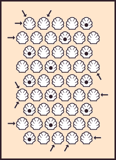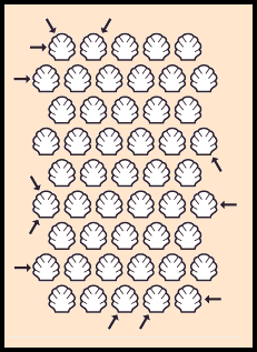 في الشكل الآتي 49 صدفة و12 لؤلؤة مخبأة فيها. أوجدها بالاستعانة بالأسهم.حيث إن كل سهم يشير إلى لؤلؤة واحدة فقط وكل لؤلؤة مؤشرة بسهم واحد فقط ولا يوجد هنالك لؤلؤتان متجاورتان . أوجد الأصداف التي تحتوي على اللآليء . | ||
