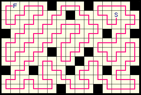 ابدأ من المربع ( S ) وانتقل أفقيا وعموديا لتصل الى المربع ( F ) مارا من جميع المربعات بدون تكرار . |