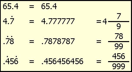 استعمل الأرقام ( 0 , 4 , 5 , 6 , 7 , 8 , 9 ) وثمانية نقاط في عملية جمع فقط للحصول على 82 . يستعمل النقاط الثمانية كفارزة عشرية أو للدلالة على تكرار الرقم أو الأرقام بعد الفارزة العشرية حيث يدل النقطة فوق الرقم تكرار ذلك الرقم كما في الأمثلة التوضيحية الآتية: | ||