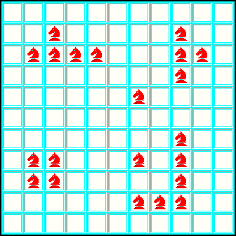 ضع 21 حصانا ( إحدى وعشرون حصانا ) على رقعة شطرنج بأبعاد ( 11 × 11 ) بحيث يكون كل مربع فيه مشغول أو محتل بقطعة.بعبارة أخرى ( كل مربع فيه قطعة أو يوجد على الأقل قطعة تستطيع اللعب إلى هذا المربع ). ولتوضيح حركة الحصان على رقعة الشطرنج لاحظ الشكل أدناه. | ||||||||||||