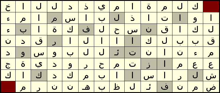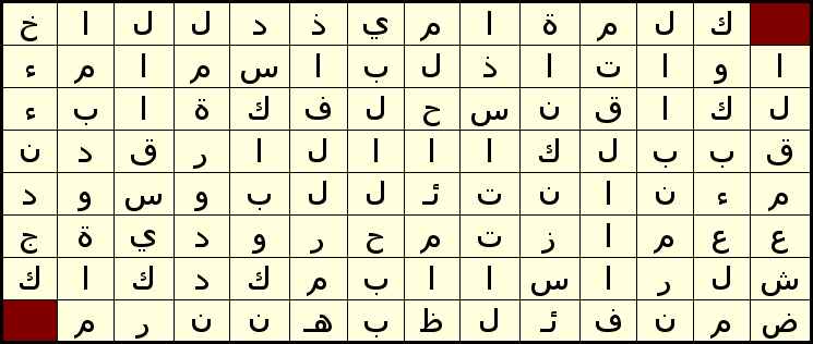 انتقل من المربع أعلى اليمين وصولا إلى المربع أسفل اليسار لتحصل على جملة سرية من أربع كلمات و سبعة عشرة حرفا على أن تنتقل على شكل حركة حصان الشطرنج وأن لا تمر من مربع مرتين . ويشترط أن تكون الجملة مفهومة المعنى وصحيحة الكلمات . فوقتا ممتعا في الحل. |