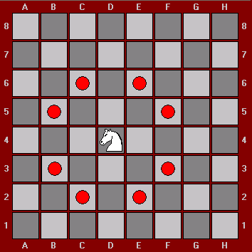 توضيح : ستبدأ من الحرف ( ك ) أو ( ا ) وتنتهي بالحرف ( ك ) أو ( ة ) . ولتوضيح حركة الحصان في الشطرنج للذين لا يجيدون اللعبة انظر إلى الشكل أدناه حيث يشير النقاط الحمراء إلى الأماكن التي يستطيع الحصان الانتقال إليها حيث أنه ينتقل مربعين في اتجاه معين وعلى خص مستقيم ( يمين أو يسار أو أعلى وأسفل ) ومربع واحد إلى أحد الجانبين. |