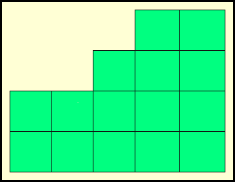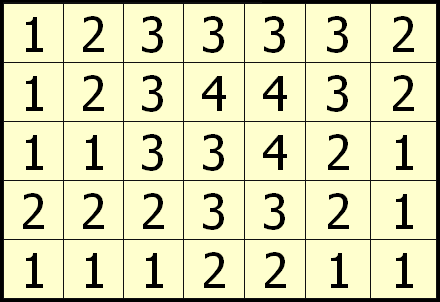 شكل هندسي متكون من خمسة عشرة مربعا . نسخ هذا الشكل الى خمسة أشكال متطابقة تم وضعت هذا الأشكال بعضها فوق بعض مع تدوير وقلب بعض منها . ونتيجة لذلك حصل تداخل بينها كما في الشكل أدناه - حيث يشير كل رقم إلى عدد المربعات المتداخلة ( بعضها فوق بعض ) فما هو هذا الشكل الهندسي؟ | ||||||||||||