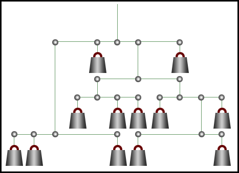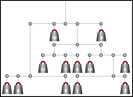 أمامك ميزان متوازن وقد وضع فيه 12 وزنا مختلفا ( من 1 إلى 12 ) كيلوغرام وبدون تكرار . أوجد هذه الأوزان مراعيا النظرية القائلة : ( القوة × ذراعها = المقاومة × ذراعها ) . | ||||||||||||